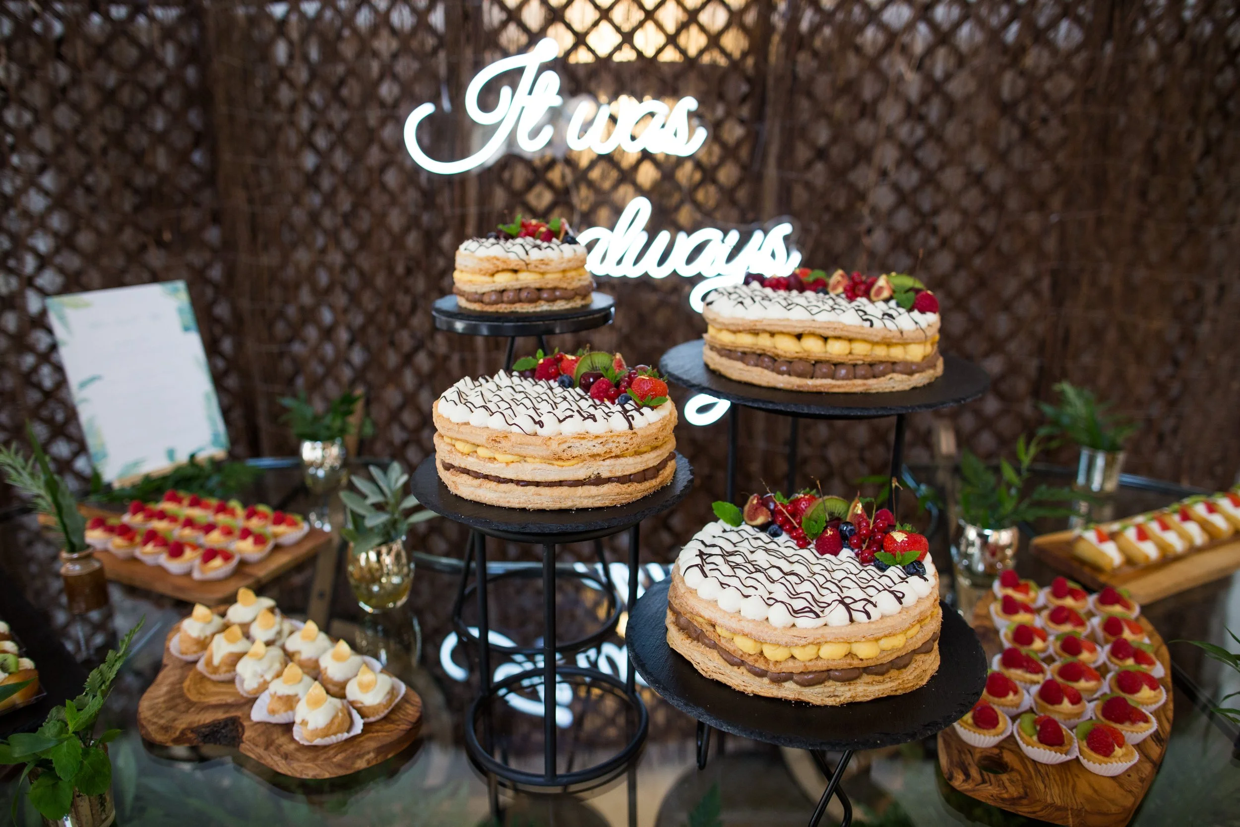 Whilst the Millefoglie may seem a humble alternative to an artistic tiered wedding cake, the theatre and beauty of it comes to life as it is assembled ‘LIVE’ at your venue in front of you and your guests.